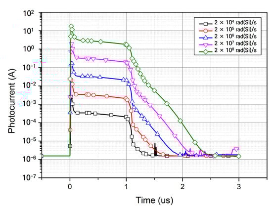 Figure 4 shows the result of converting the unit of energy rate to re-normalized prompt gamma rays from MeV/sec/kt to rad/sec/kt. At this time, the unit conversion factor was 1 MeV = 1.71981 × 10−5 rad, and the detection range was set to 2 × 105–2 × 107 rad/sec considering the distance from the blast core. As shown in Figure 5, the linear increase characteristics of the photocurrent according to the dose rate of the silicon PIN diode sensor to be fabricated were confirmed. Accordingly, the input photocurrent used for the simulation was 2 mA with a pulse width of 1 us corresponding to the minimum detection range.