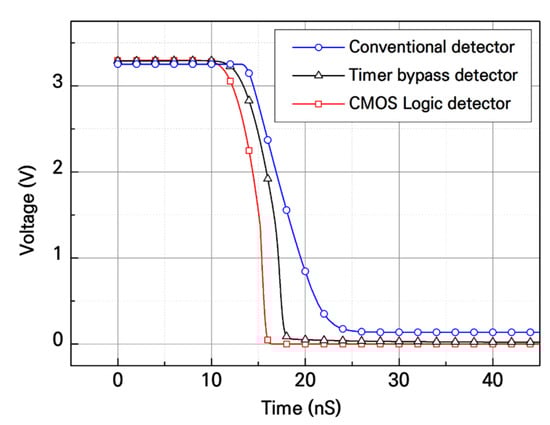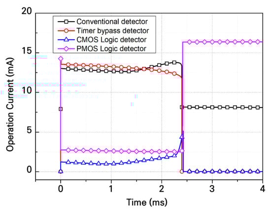 The conventional detection circuit, timer bypass detection circuit, and fast-switching CMOS-logic detection circuit were designed using the same 0.18 um CMOS process conditions, and the response delay time simulation was performed. Figure 7 shows the response time simulation result of each circuit. The reference of the low level of the detected signal used for comparison of the response delay time of each circuit was 0.4 V. A response delay time of 21.4 ns was required to change the output to a low level in the case of the conventional circuit, and 17.6 ns for the timer bypass circuit. In contrast, the response delay time of the fast-switching CMOS-logic pulse-signal detector was 15.8 ns; this is equivalent to an approximate 26% improvement compared with that of the conventional circuit. The fast-switching CMOS-logic detection circuit shortened the delay time owing to its resistance. Because there was no current limit according to resistance, it has the advantage in that it can be designed in practice to achieve a higher speed than the simulation result by adjusting the W/L ratio of the MOSFET. Moreover, compared with the conventional circuit, the stable output can be observed without offset in the high/low state of the detected signal. As shown in Figure 8, when the conventional, timer bypass, proposed, and p-MOSFET-based proposed circuits operate under the same conditions, the average current consumptions are 11 mA, 7.8 mA, and 0.87 mA, respectively. Thus, the proposed circuit can reduce the average current consumption by approximately 92% or more compared with the conventional circuit. Additionally, although the average operating current of the proposed circuit based on p-MOSFET, which will be mentioned later, increases to about 9.5 mA, it has high tolerance to accumulated radiation. Therefore, there is a negative relationship between the radiation tolerance and the current consumption.
