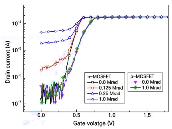 When the pulsed-radiation detection circuit is designed using the CMOS bulk process, the TID effects of the n-MOSFET, which is vulnerable in a cumulative radiation environment, should be considered as shown in Figure 9. The n-MOSFET subjected to 1 Mrad of a cumulative dose experienced performance degradation of the device by forming an abnormal leakage current path owing to hole trapping by radiation accumulated at the interface between the insulating oxide and silicon. However, damage by cumulative radiation rarely occurs in the p-MOSFET, unless it is a narrow type, because the carriers forming the default channel consist of holes (among others) [].