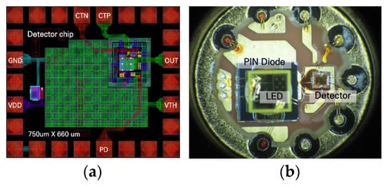The switching CMOS logic-based pulsed-radiation detection circuit proposed in this study was designed based on the SKhynix/Magnachip 0.18 um CMOS bulk process. The circuit was configured using 3.3 V MOSFETs. Finally, a radiation-hardened detection circuit based on p-MOSFET switching that is tolerant to the TID effect was fabricated. Figure 11a shows the layout drawing of the proposed circuit, and Figure 11b shows the photograph of the proposed pulsed-radiation detector package chip that contains a PIN diode and a test light-emitting diode (LED).