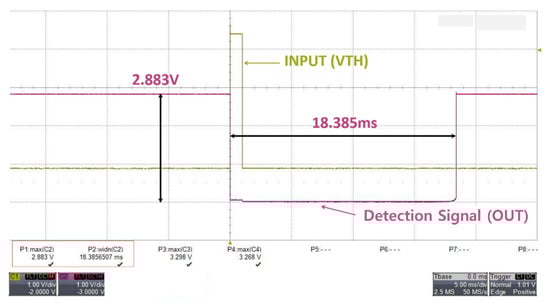 Figure 12 shows the measurement results of the proposed switching detection circuit. The pulsed radiation was simulated by the LED and the photodiode was activated by the LED with a bias voltage applied. The detection circuit was activated when a pulse signal with a voltage above a certain value according to the value of RTH for which the detection level was designed to be adjustable. Furthermore, detection signals with specific widths (18.4 ms) are outputted according to the value of CT, which is designed to enable adjustment of the pulse width of the detection signal. The normal operation of the detection signal was confirmed because it was outputted by the input pulse signal and returned after it was maintained for a certain period of time.