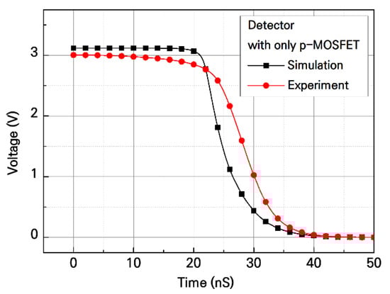 Figure 13 shows the response time measurement result of the proposed p-MOSFET-based detection circuit that is resistant to TID effects. Although a delay of approximately 5 ns occurred compared with the simulation result, it operated at 33 ns. Thus, the detection signal can perform the pulsed radiation detection and protection functions normally. Therefore, the proposed CMOS logic-based detection circuit has the advantage of being applied in various ways according to the radiation environment, because the modified design is still possible using only p-MOSFETs.
