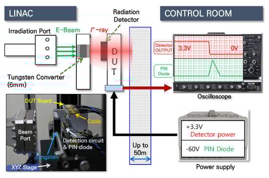 The evaluation test of the pulsed-radiation detection circuit was performed using the LINAC at the PAL. Figure 14 shows the test setup. The electron beam (60 MeV, 180 mA) outputted from the electron beam accelerator was converted to a pulse gamma ray using the tungsten transducer, and was then radiated to the detector. The measurement evaluation procedure used to verify the latch-up and disturbance thresholds of the semiconductor components caused by the pulsed radiation (responsible for the transient effect) was applied. As shown in Figure 14, the DUT board of the sample was installed in the irradiation room, and the process of checking whether the test sample operates normally or not was performed before irradiation. Whether the beam output intensity is adjusted according to the test requirements was assessed by adjusting the beam spot of the electron beam output. Subsequently, the properties of the radiation sensor (PIN diode) and detection circuit were evaluated by measuring the transient response characteristics of the devices according to the transient radiation pulse under the irradiation conditions. Through this process, the threshold resistance value of the required radiation detection range was obtained, and the normal pulse radiation detection function could thus be verified in the set detection range. This test procedure was established based on the procedure specified in MIL-STD-883H 1020.1, which is an electronic component test procedure of the U.S. Department of Defense [].