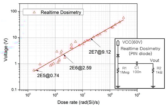 The pulsed gamma rays were normalized using the second dosimeter (Thermoluminescence Dosimeter, TLD) while repeated beam irradiation was performed several tens of times while they were inputted to the custom-made PIN diode through the tungsten transducer. The pulsed radiation detection range was found to generate an output in the range of 0.7–22 V in a state at which a 60 V reverse bias was applied with a dose in the range of 1.7 × 105–1.3 × 108 rad(Si)/s. Figure 15 shows the output voltage of the PIN diode according to the dose range.