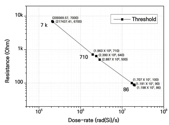 In this study, a pulsed radiation experiment was conducted to find the value of resistance Rth which corresponded to the detection range of 2.0 × 105–2.0 × 107 rad(si)/s for the switching detection circuit based on the p-MOSFET proposed in this study. Whether the p-MOSFET detection circuit operated according to the radiation dose was evaluated while Rth was changed, and the PIN diode output voltage was measured accordingly. By measuring the dose and threshold voltage at which the detection circuit operated for each resistance Rth, the resistance values were found to lie in the range of 86 Ω–7 kΩ in correspondence to a detection range of 2.0 × 105–2.0 × 107 rad(si)/s, as shown in Figure 16.