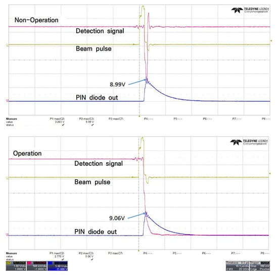 At this time, about 300 ns time passed until the beam pulse was applied to the sensor and the detection signal was output. This is due to the delay time of the 50 m cable and signal output equipment checking the output from the irradiation room to the control room. The 50 m cable (RG-174/U) used in the test has a signal delay of about 250 ns []. Therefore, the operating speed of 50 ns or less of the proposed detection circuit was confirmed.
