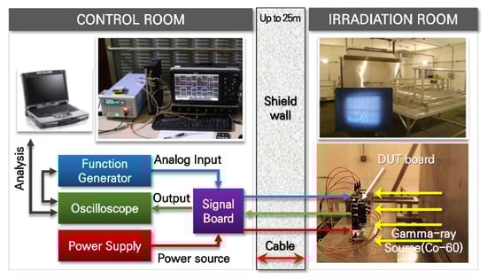 Regarding the TID measurement test setup shown in Figure 18, it was divided into a control room for applying and measuring signals and an irradiation room. A 25 m data cable was used to connect the control room to the DUT installed inside the irradiation room. The device used for the application of a bias to the test sample and the measurement system used to monitor the changes in the electrical parameters of the test samples according to the cumulative dose were installed in the control room and were configured to allow remote measurement. The experimental conditions and methods are summarized in the Table 2.