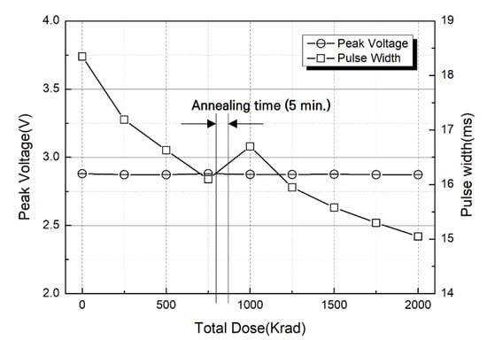 The TID measurement test result of the proposed detection circuit is shown in Figure 19. An observation of the changes in the output according to the rising cumulative dose confirmed that the peak voltage was not changed. The pulse width of the output signal decreased by approximately 3.4 ms from 18.4 ms before irradiation to 15 ms after irradiation.