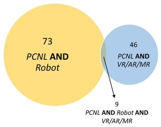 The topics comprised searches through titles, abstracts and keywords, and the superscript * in robot* was used to include all words with the same root, e.g., robot, robotic and robotics. The search has been limited to the contributions of the last decade, from 2012 to 2022. The results of the queries are depicted in the Venn diagram of Figure 1. In particular, it can be noticed that the number of contributions where PCNL is related to robotics is 73 (query 2); most of them come from medical journals and consist in the study of the feasibility of robot-assisted PCNL. The usage of virtual/augmented reality systems in PCNL has been investigated in 46 contributions (query 1). The intersection among queries contains just nine entries (query 3), showing that the idea of merging robotic assistance and virtual/augmented reality for PCNL surgery is still an emerging application.