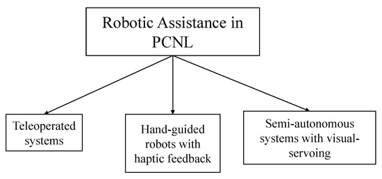 The block diagram of Figure 2 shows the currently available categories of robotics systems for assistance in PCNL surgery. Table 1 summarizes the latest literature on robotic-assistance in PCNL.