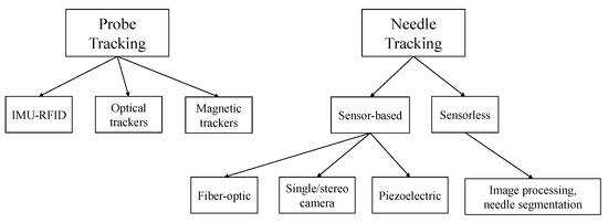 The classification of tracking methods for the ultrasound probe and for the surgical needle.