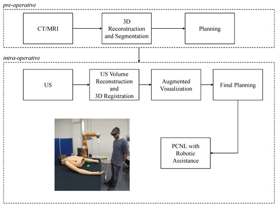 In the context of PCNL surgery, for experienced surgeons, augmented reality visualization of the renal anatomy has been proven to be sufficient for estimating the correct needle angles to reach the target. Such visualization is enabled by the proper tracking and registration of the internal conditions of the anatomical structures of the patient reconstructed intraoperatively by means of ultrasound images. This review has analyzed the available methods for tracking the probe [43,44,45,46,47,48,49,50,51], classifying them on the basis of the adopted technology (i.e., IMU-RFID sensors, optical cameras or magnetic trackers). In addition, the tracking of the surgical needle is useful for having feedback on the insertion and puncturing step. References [52,53,54,55,56,57,58,59,60,61] address the problem of detecting the needle and estimating the tip position, by proposing sensor-based or sensorless approaches. However, several doubts persist as to whether urologists in training might need additional technical assistance apart from only AR support. To this end, the integration between augmented reality and robotic assistance can help urologists in training by reducing the learning curve and enhancing the outcomes of the intervention by supporting the surgeon during both pre-operative and intra-operative phases, as proposed in the system developed by [62]. In more detail, as depicted in Figure 4, in the pre-operative phase, the 3D reconstruction and segmentation of the patient anatomy were performed on the basis of CT/MRI scans so that the surgeon can plan a first trajectory to insert the surgical needle. In the intra-operative phase, organs’ poses may be slightly different with respect to those reconstructed in the pre-operative phase, so freehand ultrasound scans can be used to acquire the current 3D volumes of the organs to be aligned, and by means of computer vision algorithms, the 3D segmented models of the corresponding organs. The usage of an AR device can allow the surgeon to visualize in real time the segmented 3D models of the anatomical parts of interest, reconstructed from CT-imaging, directly on the patient body, so that the insertion trajectory can be easily replanned. Furthermore, a robotic system can assist the surgeon during the puncturing and the needle insertion by providing force feedback with the aim of avoiding the misalignment of the needle from the planned trajectory. Indeed, several robotics systems have been recently developed for assistance during PCNL surgery [36,37,38,39,40,41]. Some of them consist of teleoperated robots controlled by the surgeon, and more advanced systems can provide haptic feedback during hand guidance or can have a certain degree of autonomy by exploiting visual-servoing.