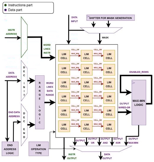 The RI5CY core has only one memory for both instructions and data. The instructions and data parts of the memory share the same physical memory and there is no specific address that divides the two parts. The management of the division between them is left to the compiler. Therefore, as for the standard RI5CY memory model, the new architecture involves a dual-port memory, such that fetch and load-store operations can occur in the same clock cycle with two decoders corresponding to the two ports, creating the possibility of addressing all memory locations. In addition, the implemented LiM adds some logic around the memory array and within the memory array itself. The result is a memory capable of performing basic bitwise operations and a few simple algorithms.