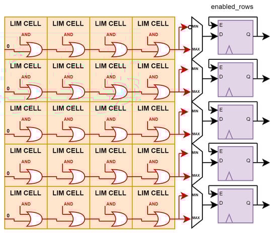 - Additional logic around memory completes the one clock cycle step of the algorithm. This part of the logic evaluates the wired-or net corresponding to the words of interest. In the case of maximum computation, words with the wired-or bit equal to 1 are considered in the next cycle. Otherwise, these words are excluded from the comparison. The opposite procedure is performed in the case of minimum computation. The information of the enabled words is stored inside the registers’ enabled_rows and updated cycle by cycle. The initial value of these registers is given by the range address decoder, according to the range of words that are of interest. During execution, only the registers of the enabled_rows equal to 1 can be updated by the wired-or result each cycle. At the end of the algorithm, the enabled word registers that show a 1 correspond to the memory words with the maximum/minimum value.