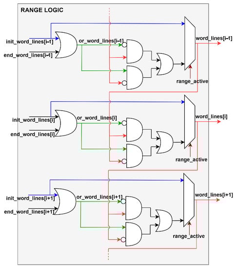 The range operations require a starting address and involvement of a range of 32-bit words, both provided by the processor. The logic adopted to enable the required word lines is shown in Figure 6. The range decoder logic requires two standard address decoders, one for the starting address and one for the end address (the end address is computed by adding the range to the starting address). The output of the two decoders is combined so that only the lines in between are effectively activated. In non-range operations, only the starting address is considered and the range logic is bypassed.