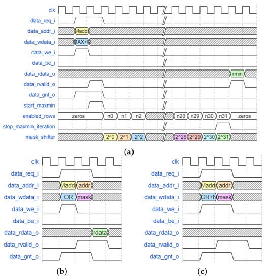 Waveforms for memory interface implementation. Simulations are performed with Mentor QuestaSim software. (a) Load Max/Min. (b) Load OR/AND/XOR. (c) Store OR/AND/XOR.