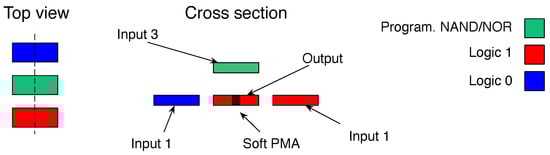 The soft PMA spot, located at the center of the output, is more sensitive to the magnetic field variations and, therefore, is where the domain wall nucleates. This spot is tuned by focused ion beam irradiation []. The logic function implemented by the computing cell is . Therefore, the value of IN3 programs every single cell to operate as NAND or NOR when IN3 is equal to 1 or 0, respectively. The value of the output element is defined by the superposition of the three surrounding inputs and the sign of the external magnetic field. The external field brings the output close to the coercivity field and then the switching is supported or prevented by the value of the surrounded inputs [,]. The global out-of-plane field can be generated on-chip, sandwiching the magnetic stack between cladding material [].