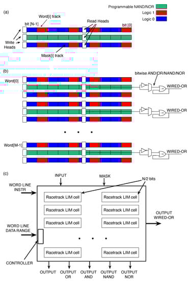 By arranging multiple computing cells, as displayed in Figure 10, in a track-like structure (Figure 11a), it is possible to build the computing word line. At least one write and read head are necessary for modifying and accessing the stored data. Two distinct ports are available per track, one for writing and one for reading operations. Domain walls are nucleated by the write head and shifted sequentially by a low current pulse into the in track []. The measured current density for nanosecond long pulses is ≈1 × 10 A/cm for Co/Pt tracks [,] and ≈5 × 10 A/cm for CoFeB/MgO tracks []. Here, racetracks made of CoFeB/MgO are considered. One track is used for storing the memory values. The programmable track defines the logic function implemented in every computing cell. In the third track, it is possible to load the mask for performing bitwise operations.