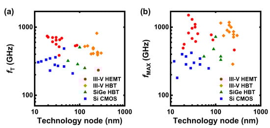 A lot of research has been done on RF devices using III-V HEMT, III-V HBT, SiGe HBT, and Si CMOS technology over a long period. Although the RF performance of various technologies has been improved with the scaling down of technology nodes, the III-V-based devices exhibit outstanding RF performance when compared with the other technologies due to their high electron mobility. The figure of merit (FOM) is used to estimate the performance and capabilities of various technologies. The main FOMs of RF devices are the unity current gain cutoff frequency (fT) and unity power gain cutoff frequency (fMAX). Figure 2 shows fT and fMAX of the state-of-the-art III-V HEMT, III-V HBT, SiGe HBT, and Si CMOS. The fT and fMAX represent the frequency at which the transistor provides a unity gain. The transistor cannot provide gain at frequencies higher than fT and fMAX.