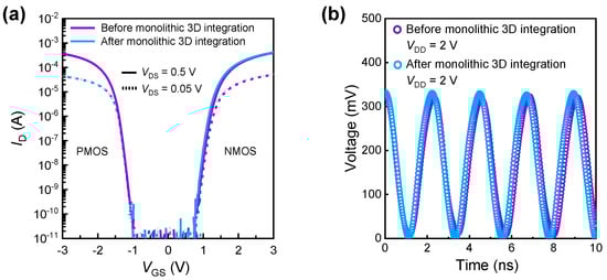 (a) Transfer characteristics of bottom single Si MOSFET before and after monolithic 3D integration. (b) Output waveform of VCO based on a ring oscillator composed of multiple Si MOSFETs.Reprinted with permission from Ref. [10]. 2022, ACS Nano.