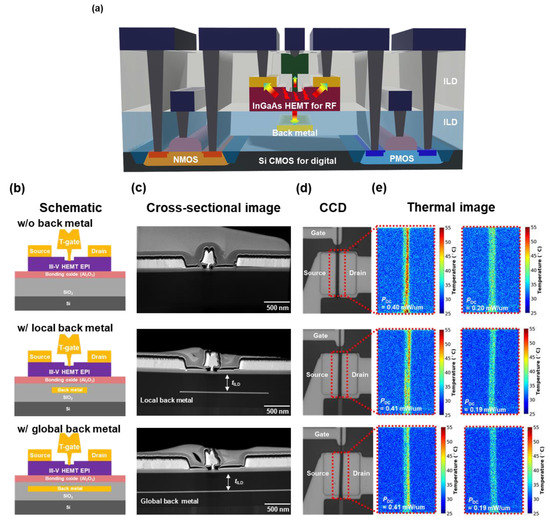 Another critical issue in monolithic 3D systems is the self-heating of top devices, which can affect the device’s performance. As reported by many research groups, the top devices are thermally isolated by an interlayer dielectric which has a low thermal conductivity, thereby, the performance and reliability can be degraded [39,40]. In the monolithic 3D system, the self-heating of the top device is one of the limiting factors in high performance, hence, many groups have reported on the self-heating effect in the M3D systems [39,40]. We presented one of the possible solutions to relaxing self-heating by introducing the metal plate, which has a high thermal conductivity at the backside of the top RF devices, as shown in Figure 8a [41,42]. The embedded metal can act as an additional heat dissipation path because the metal has high thermal conductivity. We used high-resolution thermoreflectance microscopy (TRM) to investigate the self-heating during the transistor operation [41,43]. Since variation in relative reflectivity (∆R/R) has a linear relationship with variation in surface temperature (∆T), the temperature of the device can be determined by detecting the change in reflectivity(R). The real-time thermal distribution of 3D integrated InGaAs-based RF transistors with different structures is shown in Figure 8b–e.