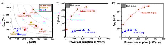 (a) The important FOMs of fT and fMAX are shown with different types of state-of-the-art monolithic 3D RF transistors. The (b) fT and (c) fMAX versus power consumption of InGaAs on Si and Si on Si. The best performances of each technology were used for comparison.