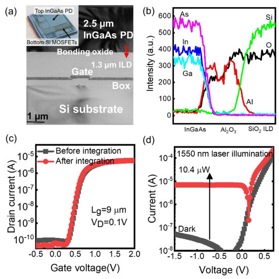 (a) Cross-sectional low-magnified TEM image of InGaAs PDs on SOI-MOSFETs with SiO2 ILD layer and inset photograph for an actual chip. The red arrow is the EDX scan line. (b) EDX line profile of various atoms of In, Ga, As, Si, O, and Al along to the red arrow in Figure 11a. (c) The transfer curves of SOI-MOSFET with 9-μm gate length before and after monolithic 3D integration. (d) Current-voltage characteristics of InGaAs PD with a 1550-nm laser under dark/light conditions. The current is increased after laser illumination. Reprinted with permission from Ref. [15]. 2022, IEEE.