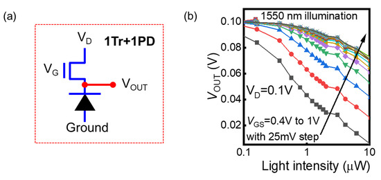 Finally, we investigated the readout function for mimicking the actual ROIC operation using M3D integrated InGaAs PDs on SOI-MOSFETs. In actual ROIC operation, Figure 13a illustrates the fundamental building block of typical circuit configurations, such as direct injection and source-follower per detector [63]. Although IC operation mechanisms vary in many configurations, the basic element close to PDs is a simple combination of 1 PD and 1 Tr. Thus, we evaluated the fundamental function of IC operation in M3D integrated InGaAs PDs on SOI-MOSFETs (1PD and 1Tr structure). The readout voltage (Vout) measurement was performed for the top InGaAs PD layer under the illumination condition of a 1550 nm laser. Figure 13b shows the resulting Vout as a function of the light intensity by varying the gate bias (VGS) from 0.425 V to 1 V, where 0.425 V of VGS is in the subthreshold regime. This is due to the SOI-MOSFETs’ ability to function as a charge transfer gate in direct injection mode, where photo-generated carriers are directly injected via the source on the output stage. Vout gradually increased as VGS increased from 0.4 V to 1 V, which could be attributed to the division of resistance between Tr and PD caused by the Tr resistance decrease. Furthermore, in fixed VGS, increasing light intensity from 0.1 to 10 μW resulted in the Vout decrease due to PD resistance decrease. These results suggested the successful mixed-signal operation of the direct injection mechanism of ROIC by using M3D integrated PD and Tr structure. Recently, we demonstrated an M3D integrated MicroLED display on CMOS driver IC with a low-temperature process [17]. This integration process could be directly applied to integrated PD on ROIC in the future.