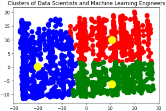 Data scientists and machine learning engineers grouped in three clusters (The picture is a visualization which clusters our data into 3 groups. One can easily notice that the positions of centroids, in the centre of each group, suggest that there are 3 clusters or groups of data. The analysis for each group follows this plot).