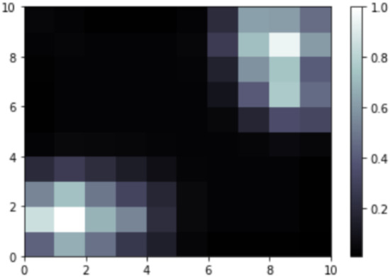 The self-organizing map (outliers = brighter cells. Numbers on the right vertical axis show the distance from each centroid. Numbers on the left vertical axis show the coordinates of each data point).