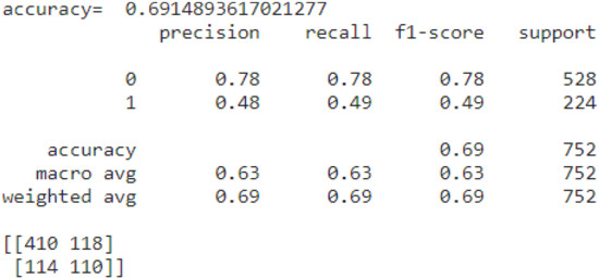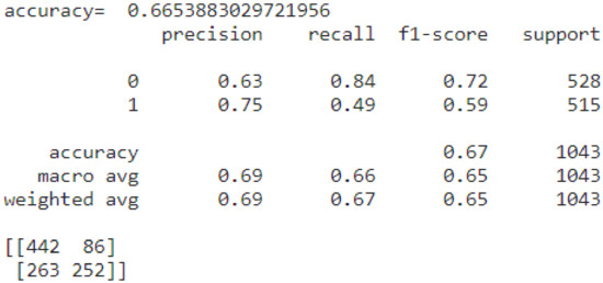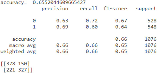 We designed a classification neural network with two hidden layers, 200 neurons per layer, a batch size of 12, and a number of 150 epochs. As activation functions for the input and hidden layers, we used the rectifier linear unit (ReLU). For the output layer, we used the sigmoid function. Choosing ReLU for the hidden layers and sigmoid for the output layer are considered by the current literature to be the best choices in designing a supervised neural network model. The supervised neural network had an accuracy of 69.14%. The classification metrics are presented in Figure 5.