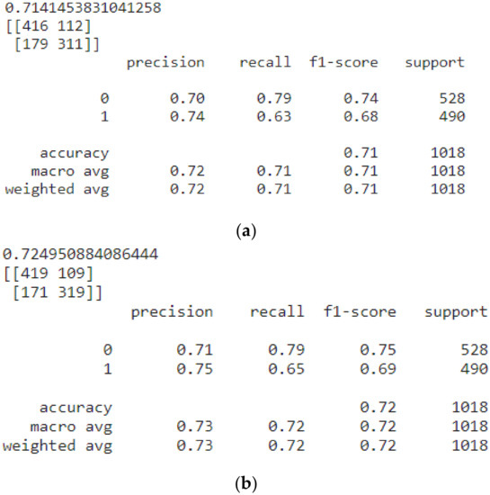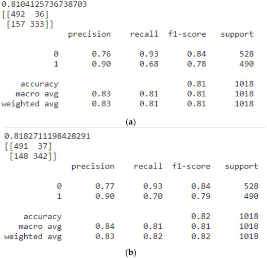 We validated our model by applying the random forest classifier algorithm before and after applying feature engineering. The results are presented in Figure 10a,b.