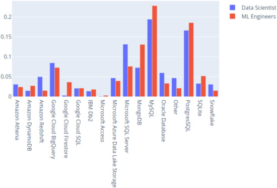 Google Cloud Firestore is a big data product used in a greater percentage by ML engineers. Moreover, MongoDB is another product used by them, but data scientists also prefer it. Data scientists use Microsoft SQL Server in a greater proportion than ML engineers. MySQL, SQLite and PostgresSQL are used more by ML engineers.