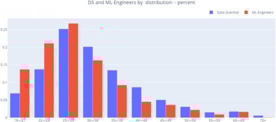 The dataset contains information about different individuals who are engaged in activities related to DS and ML. The variables are 100% categorical as the questions are multiple-choice questions. Data scientists represent 13.9% from the total number of Kaggle’s survey respondents, and machine learning engineers represent 5.6% from the total (Figure 1).