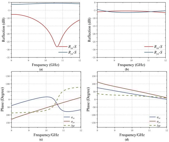 The simulated reflective coefficients of APCM. Amplitude of coefficients (a) PIN-off, (b) PIN-on, phase of coefficients, (c) PIN-off, and (d) PIN-on.