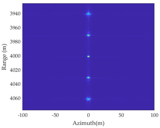 In order to visualize the effect of false target generation by TAJM, the simulation calculation of 2D SAR images was performed. Figure 4 shows the simulation result of 2D SAR images of the single point target which is modulated by TAJM method with fs = 15 MHz. In the Figure 4, the multi-target phenomenon can be observed with a total of five targets. Four virtual targets are symmetrically distributed on both sides of the original target. Next, the multi-target and distance transformation phenomena are analyzed in terms of the distance-oriented profile at the location of the target scattering center.