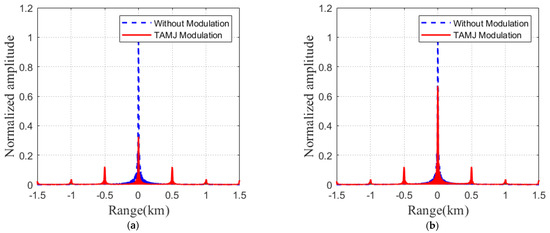 The echo signal matched filter output. The red line represents the echo signal modulated by TAJM, and the blue one represents the original target echo. (a) Co-polarization channel. (b) Cross-polarization channel.