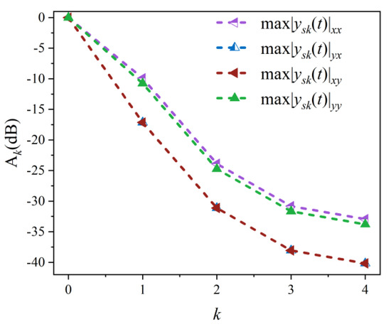 Figure 6 shows the k-th order peaks of the echo signals of the four polarization channels. The modulation frequency is fs = 5 MHz and the duty ratio α = 0.6. Energy is mainly concentrated on low-order targets, Ak decrease as K increases, so subsequent analysis focuses on low-order peaks. K is the modulation frequency of the LFM signal, which is determined by the transmitted signal. (1 − |kfs/B|) represents the mismatch degree of the matched filter when the reflected signal has a Doppler frequency shift of kfs. The ak is the Fourier expansion term coefficient of the TAJM signal Γ(t), which is affected by the phase φ, amplitude x and duty cycle α of Γ(t). The following part analyzes the effect of phase difference ∆φ = φ2 − φ1, amplitude difference ∆x = x2 − x1, and duty cycle τ on Ak.
