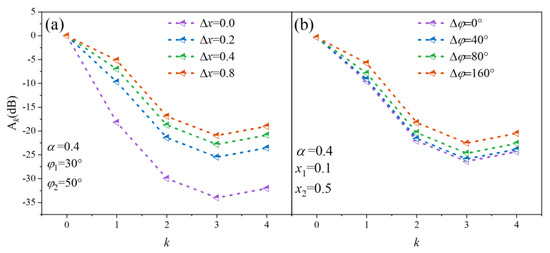 The normalized amplitude (dB) of the k-th order peak with (a) different Δx, (b) different Δφ.