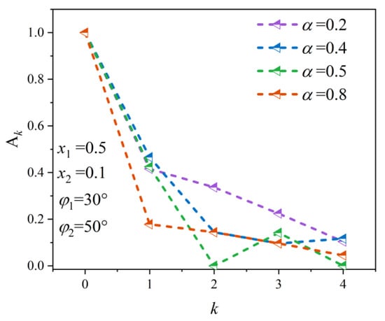 The normalized amplitude (dB) of the k-th order peak with different α.