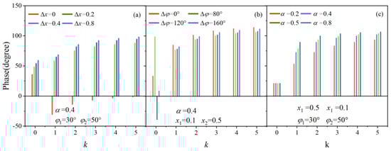 The phase of the k-th order peak with (a) different Δx, (b) different Δφ, and (c) different α.