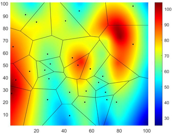 In order to determine the appropriate sensing radius, Rs, and communication radius, Rc, of the sensor nodes, the monitoring area is divided into Voronoi diagrams by the coordinates (x, y) and elevation values of the sensor nodes, as shown in Figure 5. The color bars in the figure indicate the elevation values represented by the grid points. Each sensor node calculates its sensing radius, Rs, based on the endpoints of the partition, and the sensor nodes determine the appropriate communication radius, Rc, by searching the communication links between the nodes.