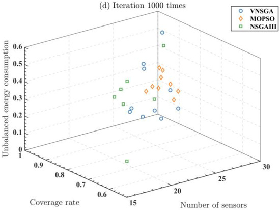 In Figure 9a–d, the distribution of the final Pareto Front in the 3D target space at different iterations of each algorithm can be seen. Where the x-axis represents the number of nodes as a percentage of the maximum number of nodes, the y-axis is the network coverage rate, and the z-axis is the unbalanced energy consumption. In the figure, the blue points represent the proposed VNSGA, the orange points denote MOPSO, and the green points represent the original NSGA-III algorithm. The VNSGA obtains the Pareto Front more abundantly than MOPSO, allowing decision-makers to choose compromise solutions. The Pareto Front obtained by VNSGA can outperform the original NSGA-III to achieve the optimal node deployment strategy for WSNs on 3D surfaces. Figure 9 shows that VNSGA’s is in between MOPSO and NSGAIII, and the proposed algorithm VNSGA has a more widely distributed solution. This allows VNSGA to obtain the best deployment of WSNs.