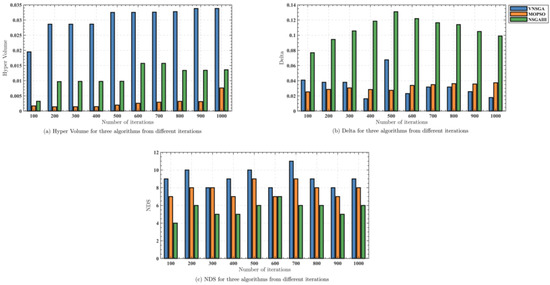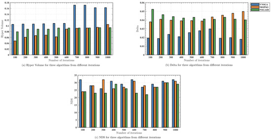 In this paper, widely used evaluation metrics in multi-objective optimization algorithms [21], Hyper volume (HV), Delta, and Non-dominated solution (NDS) metrics were used. The HV metric is the volume of the target space governed by the Pareto approximation used to evaluate convergence and distribution. The value of HV represents the algorithm’s ability to find the best solution in the target space. When the value of HV increases, it indicates that the algorithm can find more extreme solutions in the target space. The Delta metric takes the number of PF solutions and sorts them according to the first fitness value, which obtains the distribution and scatters of the solutions to measure the diversity. The value of Delta should be as small as possible so that the Pareto Solutions are spread out in the target space as much as possible, giving the decision maker a richer set of solutions. The NDS is the number of optimal solution sets obtained by the optimizer. The NDS intuitively reflects the algorithm’s ability to find solutions; the larger the NDS, the more solutions the algorithm can find. Figure 10, Figure 11 and Figure 12 show the comparison between the HV, Delta, and NDS values of the proposed algorithm VNSGA with MOPSO and the corresponding aspects of the original NSGA-III at different parameter settings. The results show that the proposed algorithm, VNSGA, has a higher Hyper Volume than the other two algorithms for different parameter settings, which indicates that VNSGA can find more extreme solutions. The delta value of the proposed algorithm, VNSGA, is also lower than the other algorithms; therefore, the solutions found by VNSGA are dispersed in the target space, which allows VNSGA to provide decision-makers with a richer set of solutions. The NDS of the proposed algorithm is higher than other algorithms, indicating that the proposed algorithm can obtain more Pareto solutions.