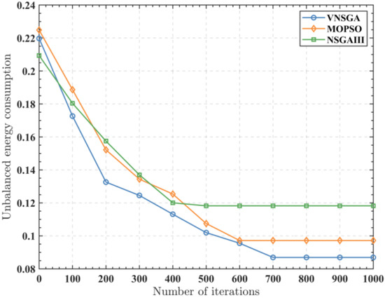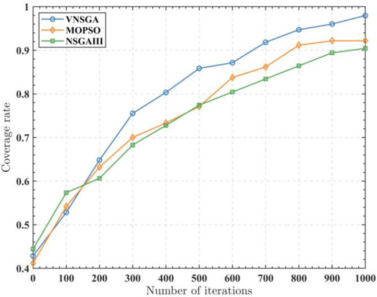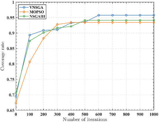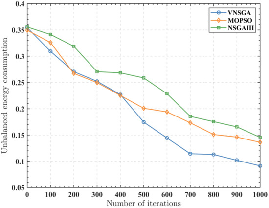 To more intuitively demonstrate the ability of the proposed algorithm, VSGA, to find extreme solutions, this paper compares the extreme values of the three optimization objectives, namely, the coverage rate, unbalanced energy consumption, and the number of sensor nodes in the Pareto solutions after completing the iterations. Figure 13, Figure 14, Figure 15, Figure 16, Figure 17, Figure 18, Figure 19, Figure 20 and Figure 21 show the unbalanced energy consumption, coverage rate, and the number of sensors for different iterations of the three algorithms with different parameter settings. As shown in Figure 13, Figure 14 and Figure 15, the proposed algorithm, VNSGA, can find the extreme solution of the unbalanced energy consumption better than the other two algorithms for a different maximum sensing radius and maximum communication radius set by sensor nodes. As shown in Figure 16, Figure 17 and Figure 18, VSNGA can find a higher coverage rate of WSNs and ensure that the WSNs can collect information in the monitoring area. As shown in Figure 19, Figure 20 and Figure 21, the extreme solution of the number of nodes found by VNSGA is lower than MOPSO but higher than NSGA-III, but the gap is not very large.