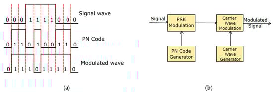 (a) Principle of DSSS. (b) Block diagram for DSSS implementation.