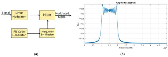 The narrowband information signal is modulated onto a carrier signal with a rapidly changing frequency. The frequency of the carrier signal changes according to the pseudo-random sequence, and the signal remains at one frequency for approximately 5–10 ms. The result of this modulation is a UWB signal. This type of spectrum spreading often uses MSK (minimum shift keying) modulation [1]. The disadvantage of this type of spectrum spreading is that this signal can be easily found in the spectrum. To prevent transmission, it is usually sufficient to jam about one-third of the frequency jumps. However, due to the unknown sequence of frequency hopping, it is still necessary to jam the entire bandwidth in which the frequency of the carrier signal changes. The block diagram for implementing FHSS is shown in Figure 2a.
