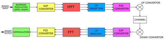 Figure 3 shows the principle of generation and demodulation of a signal with OFDM. In the frequency domain, we have many subcarriers that are independently modulated by the required data. These are then converted into OFDM symbols in the time domain using Inverse Fast Fourier Transformation (IFFT). The individual symbols can then be concatenated into one resulting OFDM pulse. A Fast Fourier Transformation (FFT) is then performed at the receiver to obtain the original data. The whole process of the OFDM modulation and demodulation is described in Figure 4. Firstly, the incoming binary data are baseband modulated by a digital modulation scheme such as BPSK, QPSK, QAM, etc. Secondly, the serial sequence is converted into parallel substreams. Then, the IFFT block converts each substream into an individual subcarrier, thus creating OFDM symbols. In the next block, the guard intervals are appended to the beginning of each OFDM symbol. Lastly, OFDM symbols are converted into a serial sequence of OFDM symbols that modulates high-frequency carriers and is transmitted via a channel. The processes in the receiver are reversed to the described processes in the transmitter [13,14,15].