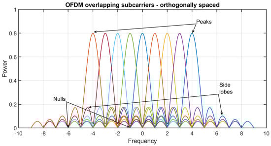 The function of this type of modulation is based on the concept of orthogonality. This concept is shown in Figure 5. Each of the subcarriers usually has a spectrum in the form of the sinc(x) function, which results in overlapping spectra between the individual subcarriers. However, if the individual frequencies are orthogonal to each other, the peak of the main lobe of one of the subcarriers corresponds to zeroes for the side lobes of the others. In this case, there is no interference that would prevent a restoration of the original data in the receiver. Consequently, the orthogonality provides high spectral efficiency. Interference between individual subcarriers occurs only in the case of loss of orthogonality [13,14].