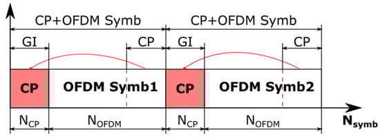 The term guard interval (GI), mentioned above, refers to cyclic prefix (CP), which is appended to the beginning of every OFDM symbol. Appending of CP reduces the effect of the inter-symbol interference (ISI). ISI occurs due to the transmission in a non-ideal transmission channel. Basically, ISI refers to spreading of the OFDM symbol that results in interference with another symbol. For mitigating ISI, the last N samples of OFDM symbols are copied and appended to the beginning of the OFDM symbol. These last N samples are called the cyclic prefix. The spread OFDM symbol then affects only the CP of the next symbol. This principle is shown in Figure 6 [14,15].